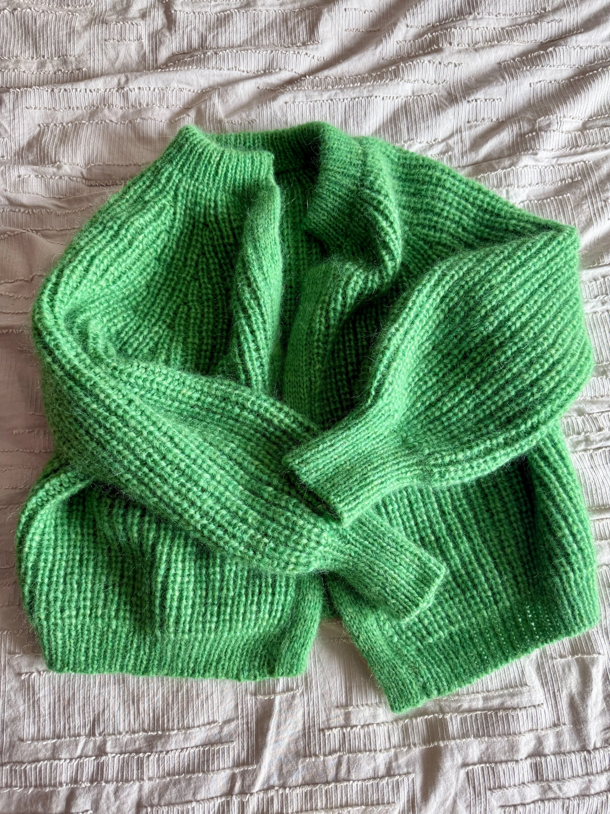 One thing I really loved about this sweater is that you FLY through the body because the wrong side is all knits instead of the usual purls. I knit the body 2” shorter than the patter (8” from underarm) and with the 2” of ribbing it hit my hips perfectly. I used the italian bind off without the tubular set up rows for the cast off. TIP: when using a sewn bind off with mohair, cut the mohair strand and tie it off at the base of the other yarn before you start the bind off. This way you’re only pulling one yarn through and you literally cannot tell you didn’t bind off with the mohair.